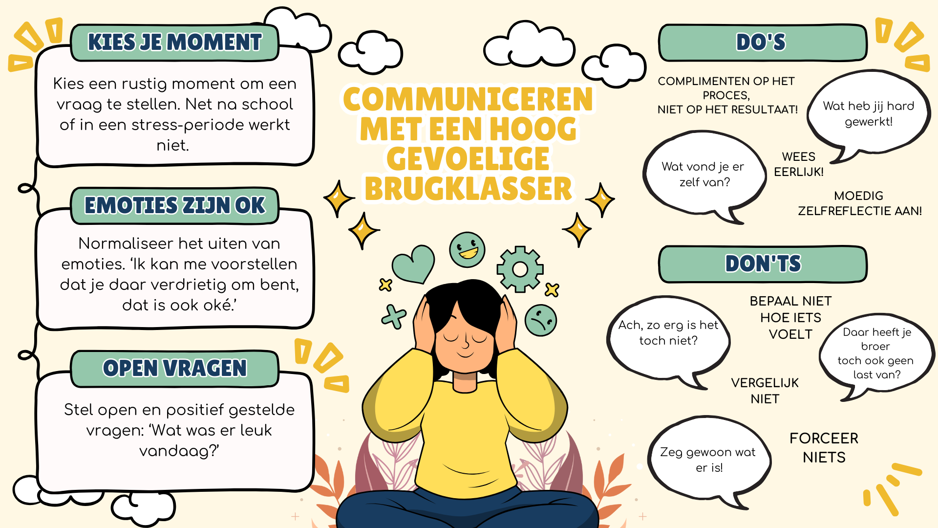 Omdat een hooggevoelig kind zo sensitief is voor gevoelens, sfeer en non-verbale signalen halen ze heel veel informatie uit communicatie. Jij denkt misschien dat je rustig praat, maar een hooggevoelig kind kan precies aan jouw stem horen hoe de vlag er bij hangt. Ook al ben jij je daar zelf (nog) niet van bewust.
